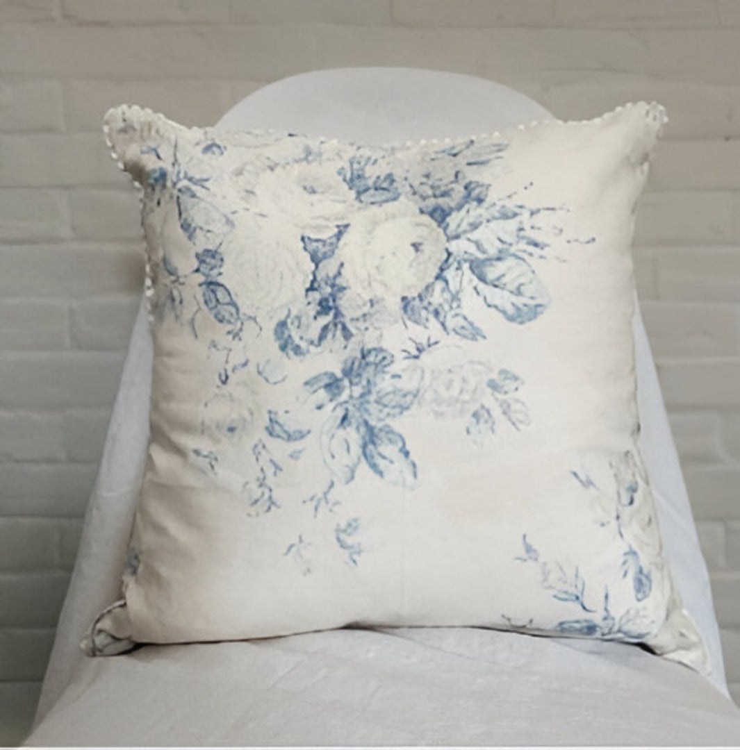 Including a down alternative insert, this charming Brooklyn Pillow in a blue floral print is adorned with a delicate white pom trim, it embodies classic French country elegance. Handcrafted in Canada from premium European linen, this versatile accent pillow is perfect for enhancing the beauty of your bed, couch, or bench.