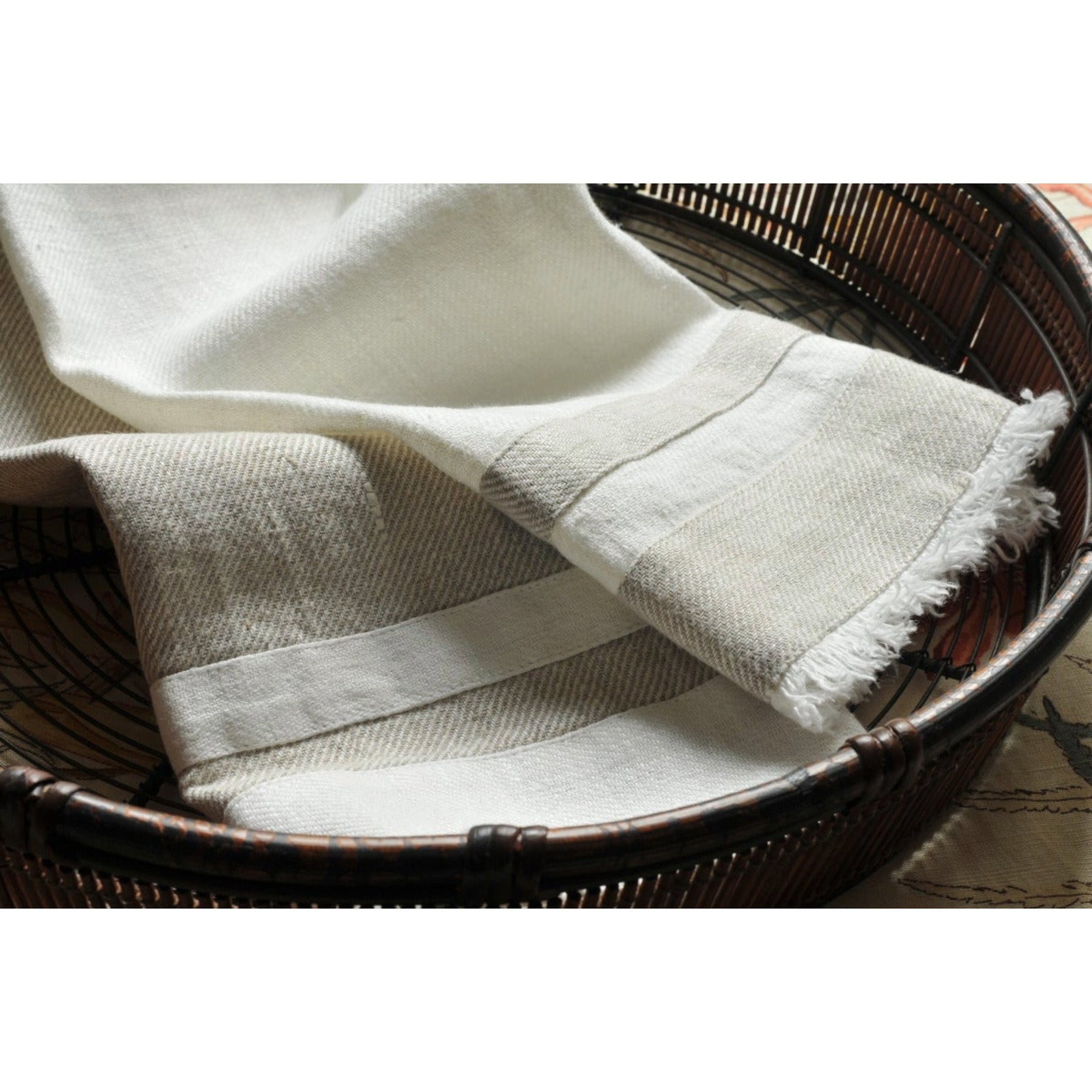 Lipari Linen Tea Towel - White with beige stripes and fringed edges.