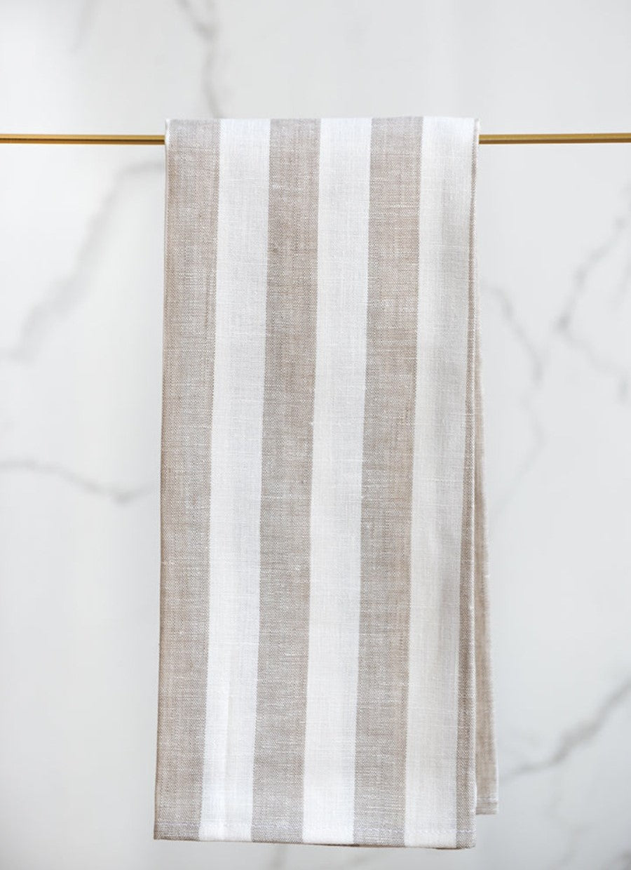 Crafted with care, this Linen tea towel features broad stone coloured stripes that elevate your kitchen to a whole new level of charm. Made from OEKO-TEX certified European linen, it offers both absorbency and durability.