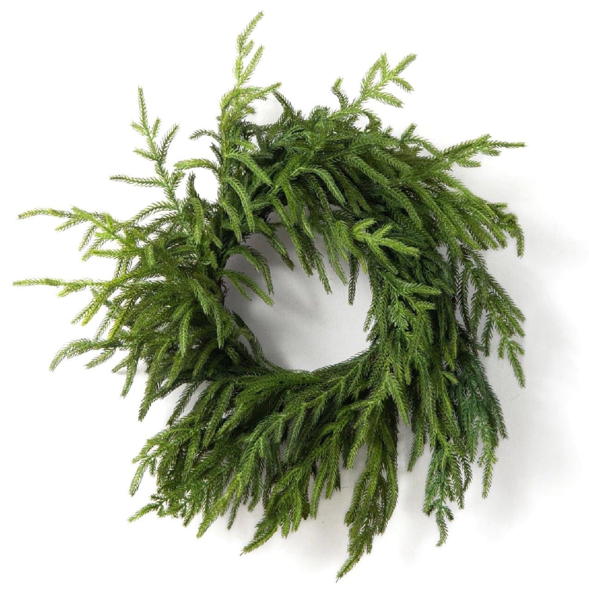 This gorgeous faux Norfolk Pine Wreath adds an airy and graceful look to your winter decor. This fresh touch wreath stays green and lush without any effort, with wired branches for easy shaping year after year. It's no wonder this 20 inch Norfolk Pine Wreath is a holiday favorite.